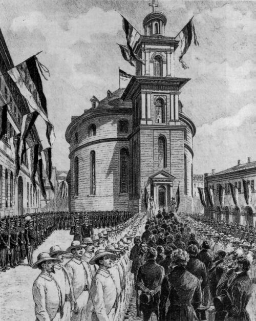 Bürger aus ganz Nassau hatten sich auf dem Platz vor dem Wiesbadener Schloss versammelt, um ihren neun Forderungen, unter anderem nach Presse- und Vereinigungsfreiheit, Nachdruck zu
